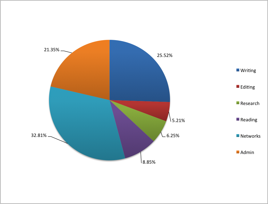One of the series of posts I produced fairly regularly on Blogger was a monthly summary of how my time had been spent and what I’d achieved. I record the necessary information using a spreadsheet, and there’s good reason for doing this: it illustrates exactly how the time is used and acts as motivation to set and stick to priorities. February was the first month I’ve been able to continue this idea and the chart accompanying this post is a visual representation of how the time in my study has been spent. Whether I continue to make public this information on a monthly basis is, as yet, uncertain. But I suspect that, human nature being what it is, I’ll continue at least as long as the trend appears to be going the way I wish. I’m a writer, as I said at the beginning of this piece. That means I should spend the majority of my time writing. And that’s both my wish and intention.