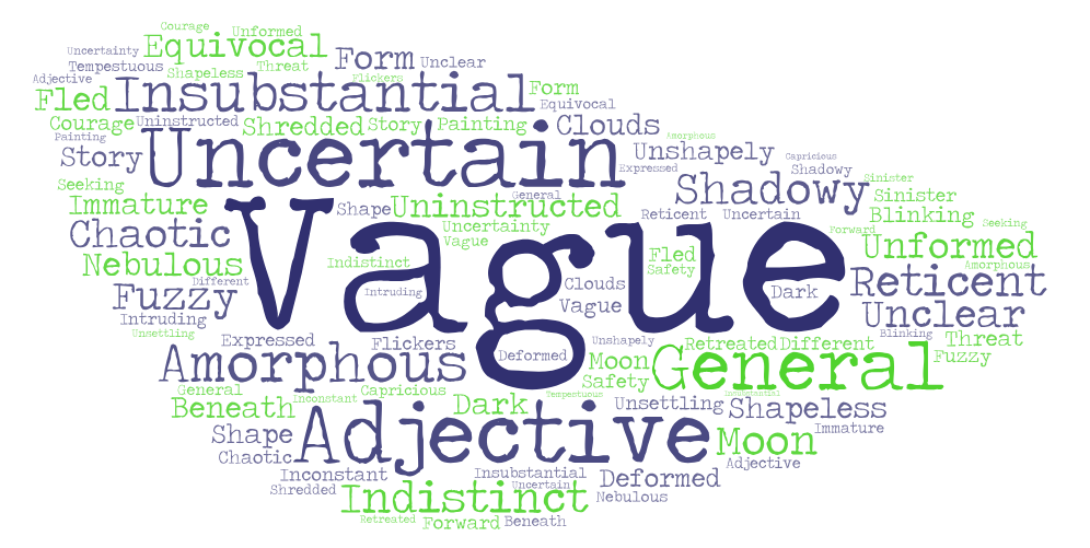 Vague: Roget lists the following subheadings for this adjective; insubstantial, general, amorphous, shadowy, indistinct, uncertain, uninstructed, equivocal, reticent, and unclear. Under amorphous are another 48 suggested alternatives including unformed, shapeless, chaotic, nebulous, fuzzy, immature, unshapely and deformed.