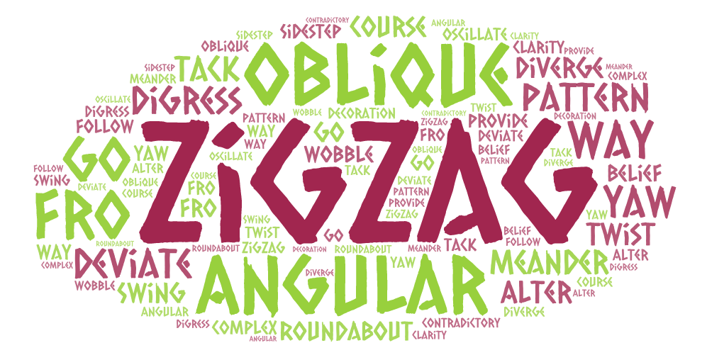 Zigzag: Roget lists these alternatives: obliquity, be oblique, angularity, angular, meander, deviating, deviate, to and fro, and pattern. The word can be used as a noun, adjective and verb. Under ‘deviate, are a further 50 suggestions including digress, go a roundabout way, diverge, alter course, yaw, tack, twist, swing, wobble, oscillate, and sidestep. I expect most of us are familiar with the zigzag pattern used for decoration, but the word has other, sometimes metaphorical, meanings.