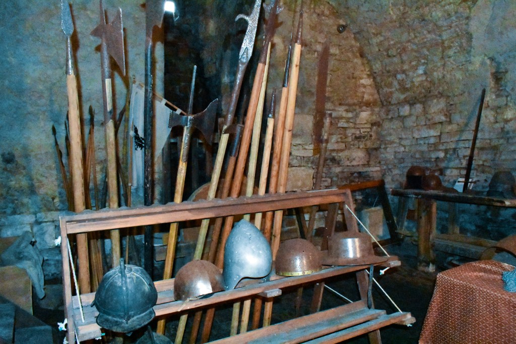 We visited the Armourer’s Workshop, where various replica weapons from the Wars of the Roses (a civil war) in the late 15th century are displayed. You’d have to be fit and strong to wield those swords and pikes! The wealthy could afford the solid armour needed to avoid sudden death from the powerful longbows in use at the time. The peasantry, often forced into acting as foot soldiers, had to make do with whatever protection they could muster and were therefore more likely to be killed than their masters.
