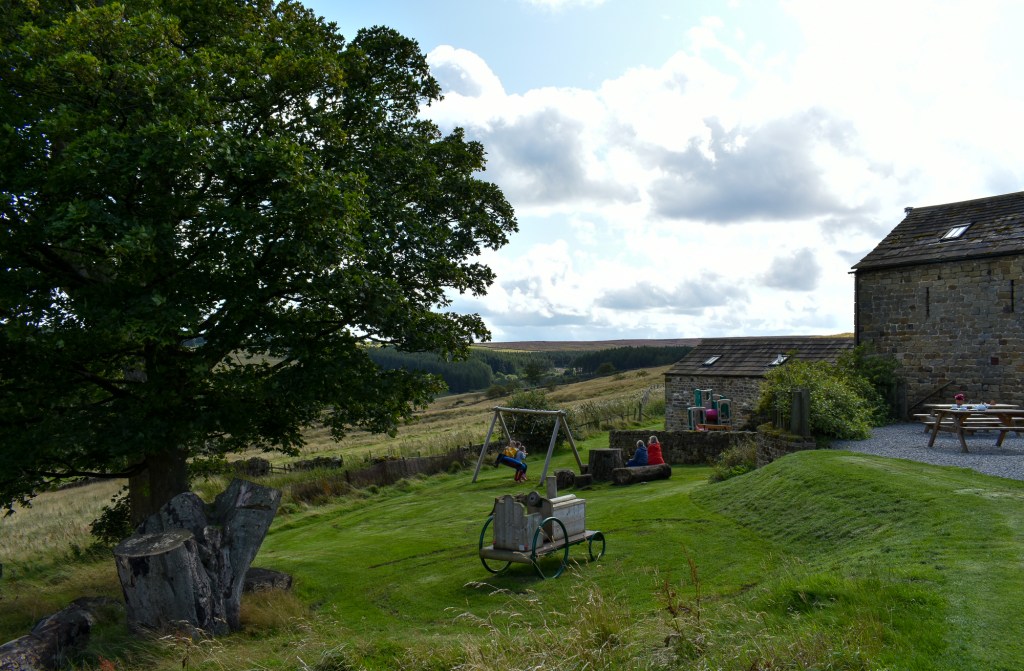 We returned to the car park, and since it was the right time of day for a snack (is there a wrong time?) we went into the café. This is one of the most happily located small eateries I’ve been in, with open views across the local dales. If you wish, and the weather permits, you can sit at one of the picnic tables outside and fully indulge in connection with the natural landscape. A small slope leads down to an area with play equipment for children.
