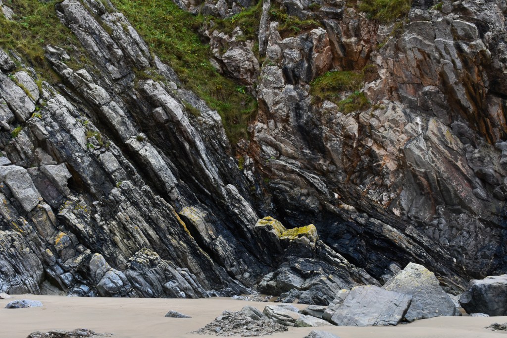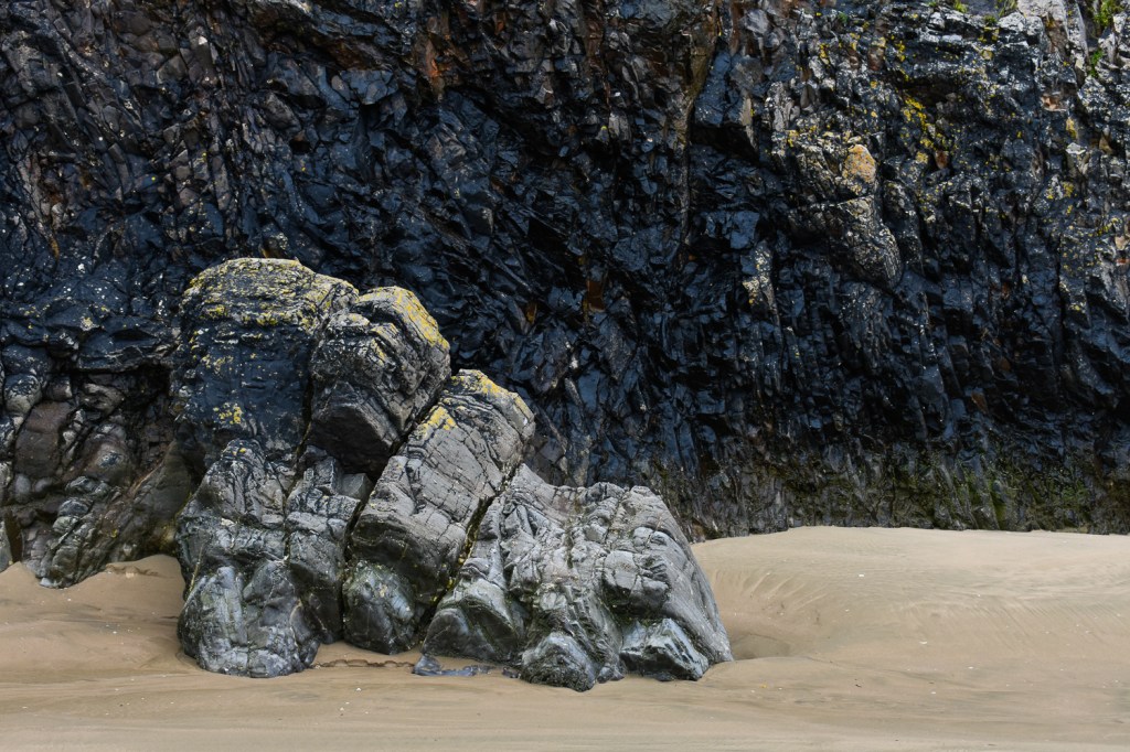 We decided to explore the beach this time. No chance (or desire) for a swim in those rough waters. As we emerged from the hotel to make our way down to the sands, it quickly became obvious the wind continued to blow hard. Initially, we’d considered walking the 3 miles (5km) along the flat beach to the small island of Bury Holmes at the northern end of Rhossili Bay. Once down on the sands, however, it became clear the windblown sand would be a real problem further up. So, we went south first to have a look at the rocks and cliffs there.