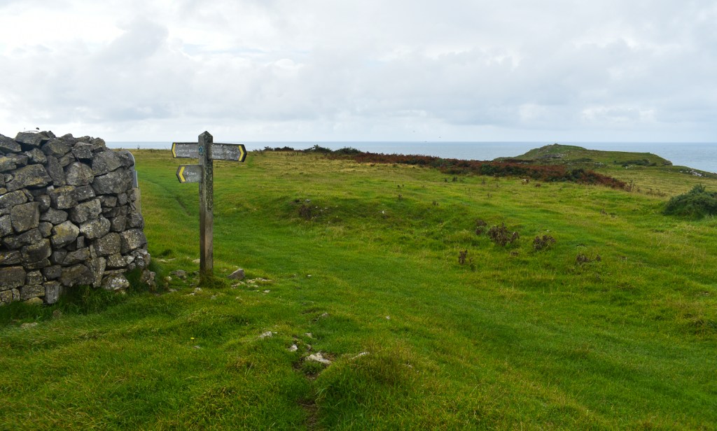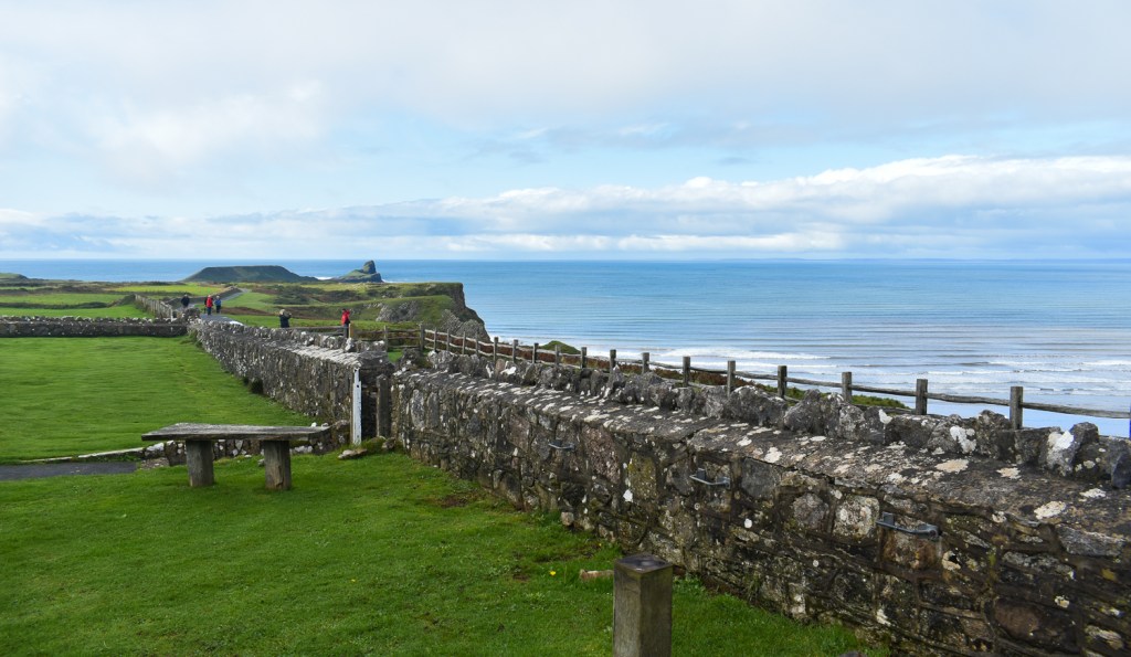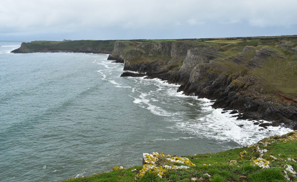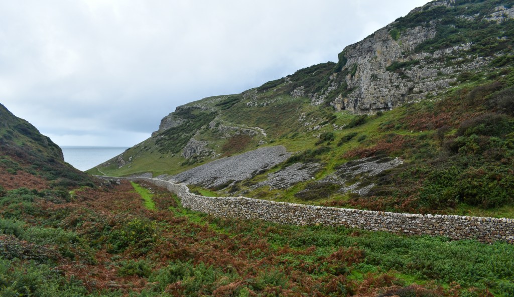 The weather remained grey, but the rain stopped as we explored the headland ahead of us. That gave fine views of the rugged coast in both directions. We continued along the path down toward the well-built drystone wall that flanks the path leading down to Mewslade Bay and then kept to the waymarked Wales Coast Path back to the visitor centre.