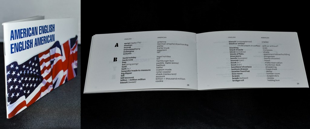 Here’s a brief sample – words are listed in American with the English version listed alongside in the first half of the book. The second half does the opposite, giving English words and their American counterparts: