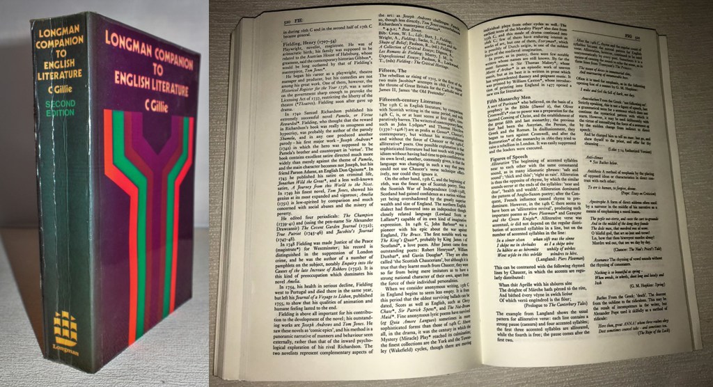 I bought it because, as a writer, I’m interested in the history and development of writing in my home language, English. The book begins with a large selection of learned essays on topics covering political history and institutions of England, society and the arts, religion, philosophy and myth, narrative literature from romance to the novel, drama in Britain, poetic form since 1350, and the history of English critical thought. This includes sections of history as dated:1066-1485, 1485-1603, 1603-1714, 1714-1815, and 1815-present day (1970).