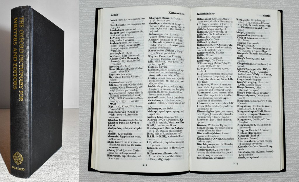 Page 213 begins with ‘Kilimanjaro, mt., E.Africa (one word, divide Kilima-njaro)’ then ‘kill (typ.), to cancel a line etc.; to distribute composed type’ The former providing a guide to the proper placing of a hyphen in the word, the latter explaining a compositor’s term (something less and less necessary in the modern world of automatic type-setting). It goes on to list the correct spellings for various towns in Ireland, indicating in which county they are found, and ends the page with ‘kintle, use quintal’ (for those of you who care, a quintal is a measure of weight equalling 100 kilograms).
