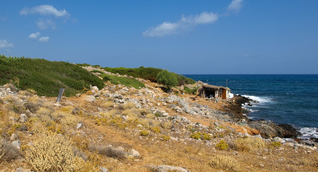 A fisherman’s hut on the coast of the Greek island of Crete. When I took this in July 2008, you could, if you wished, buy freshly caught fish from the guy who lived here for the summer.