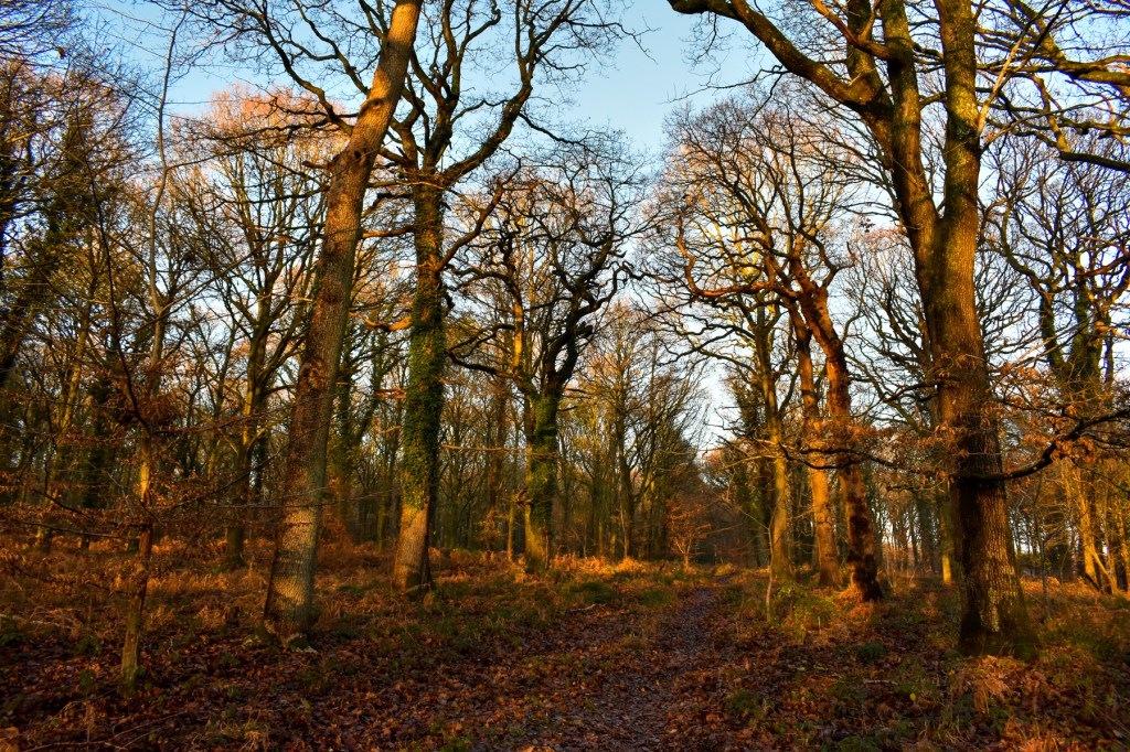 Late afternoon sun in December in a grove of oaks in the Forest of Dean