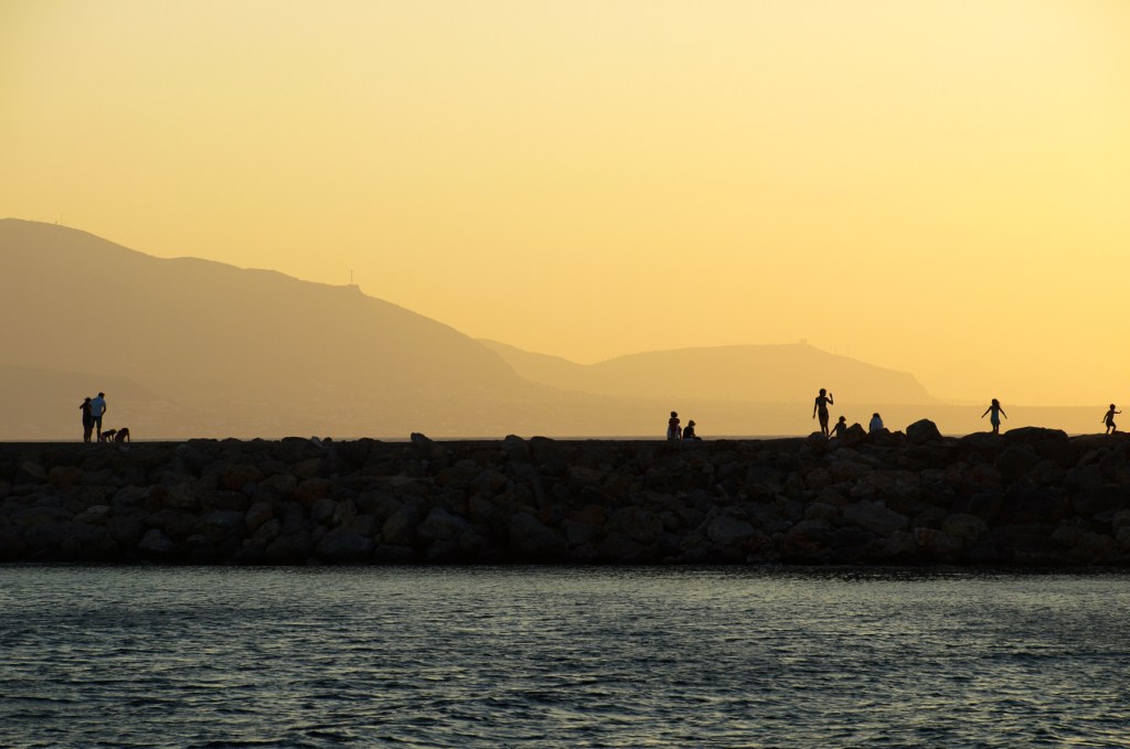 On a summer evening, people gather on the harbour wall on the island of Crete to watch the sunset. Taken August 2008