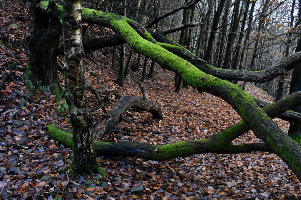 That fallen tree had closed off one of our favourite paths through a place known locally as the Dark Lane. It was a byway for horses and carts carrying coal from small mines and stone from quarries way back in the 17th century, but hasn’t been used industrially for over a century. The fallen tree didn’t stop our progress when it first fell, as we carry a pair of secateurs with us, and were able to strip away enough small branches to make a way through. Later, a local forest steward brought out his chainsaw and cut the a way through the larger parts. The moss quickly populates fallen tress, as the weather here encourages such growth.