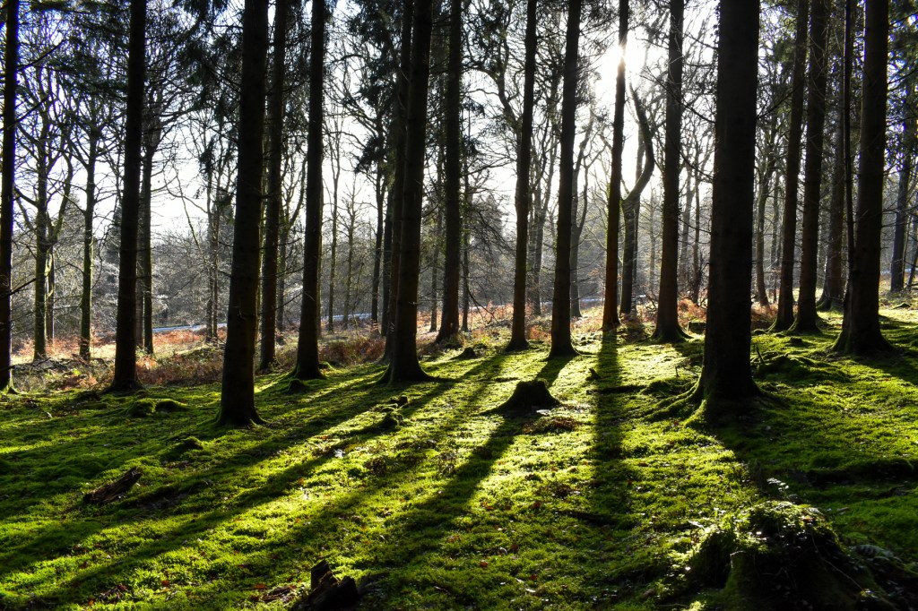 The second picture is in a place we call our ‘magical’ forest. The ground there is covered in a carpet of moss that makes it almost silent as you walk between the trees. Last time we visited, we watched a buzzard flying very low with a squirrel in its claws. The place has an aura of the unthreatening forests in many fantasy strories.