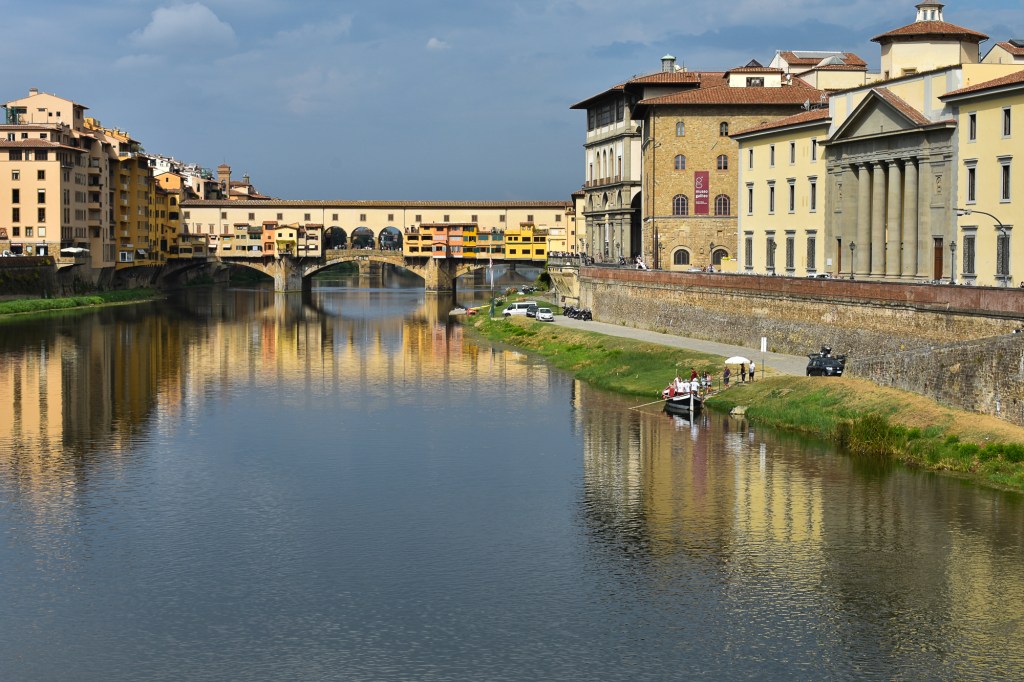 It’s the famous Ponte Vecchio in Florence, Brenda. It is lined with shops either side, as it was when re-built, after floods washed away the original wood and stone structure, around 1345. The original bridge was actually built by the Romans in 996.