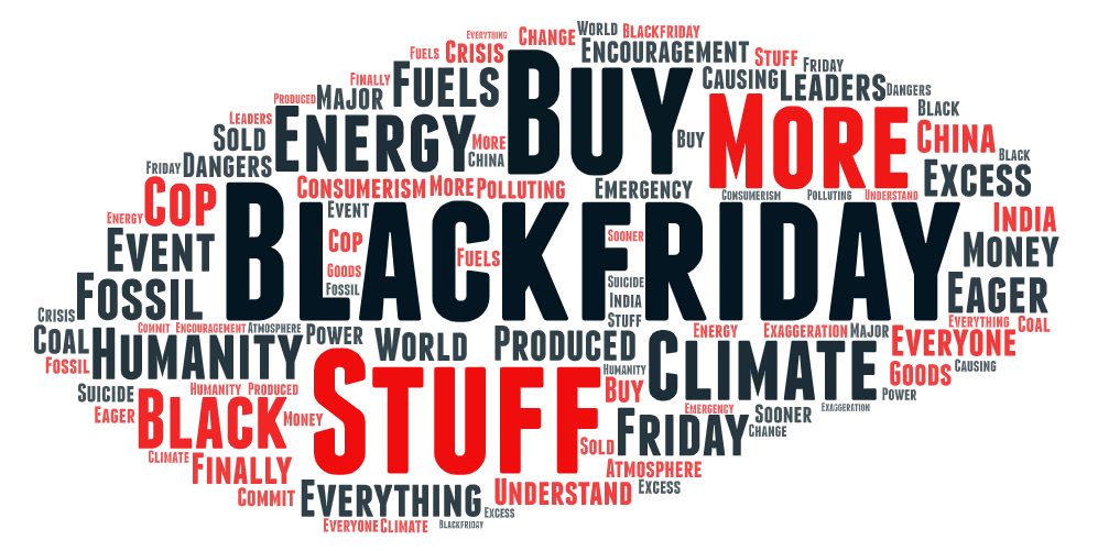 Black Friday: what is this event? Is it really anything more than an encouragement to buy more stuff we don’t need? Is everyone who’s so eager to ‘save’ money even aware of the recent COP26 discussions where world leaders finally began to understand the dangers facing humanity?