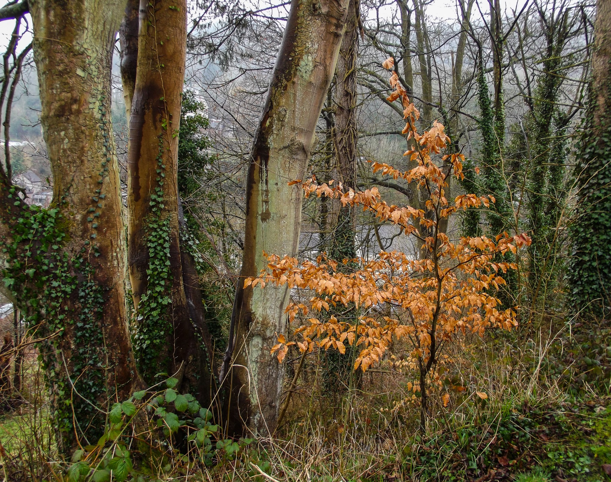 These ancient mature beeches are protected, safe from damage and destruction by humanity. Will the small, colourful, beech sapling gain the same status, or will it be removed as a nuisance lying too close to the path beside it?