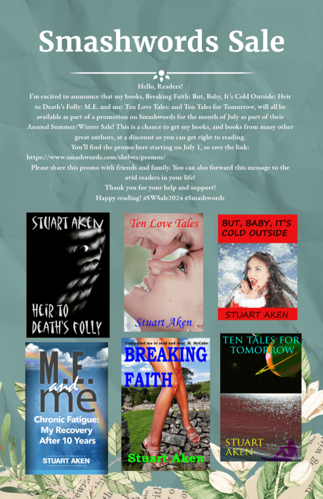 Hello, Readers, my eBooks, Breaking Faith; But, Baby, It’s Cold Outside; Heir to Death’s Folly; M.E. and me; Ten Love Tales; and Ten Tales for Tomorrow, are available as part of a promotion on Smashwords for the month of July as part of their Annual Summer/Winter Sale! This is a chance to get my books at a 50% discount, and one is free, so you can get right to reading.