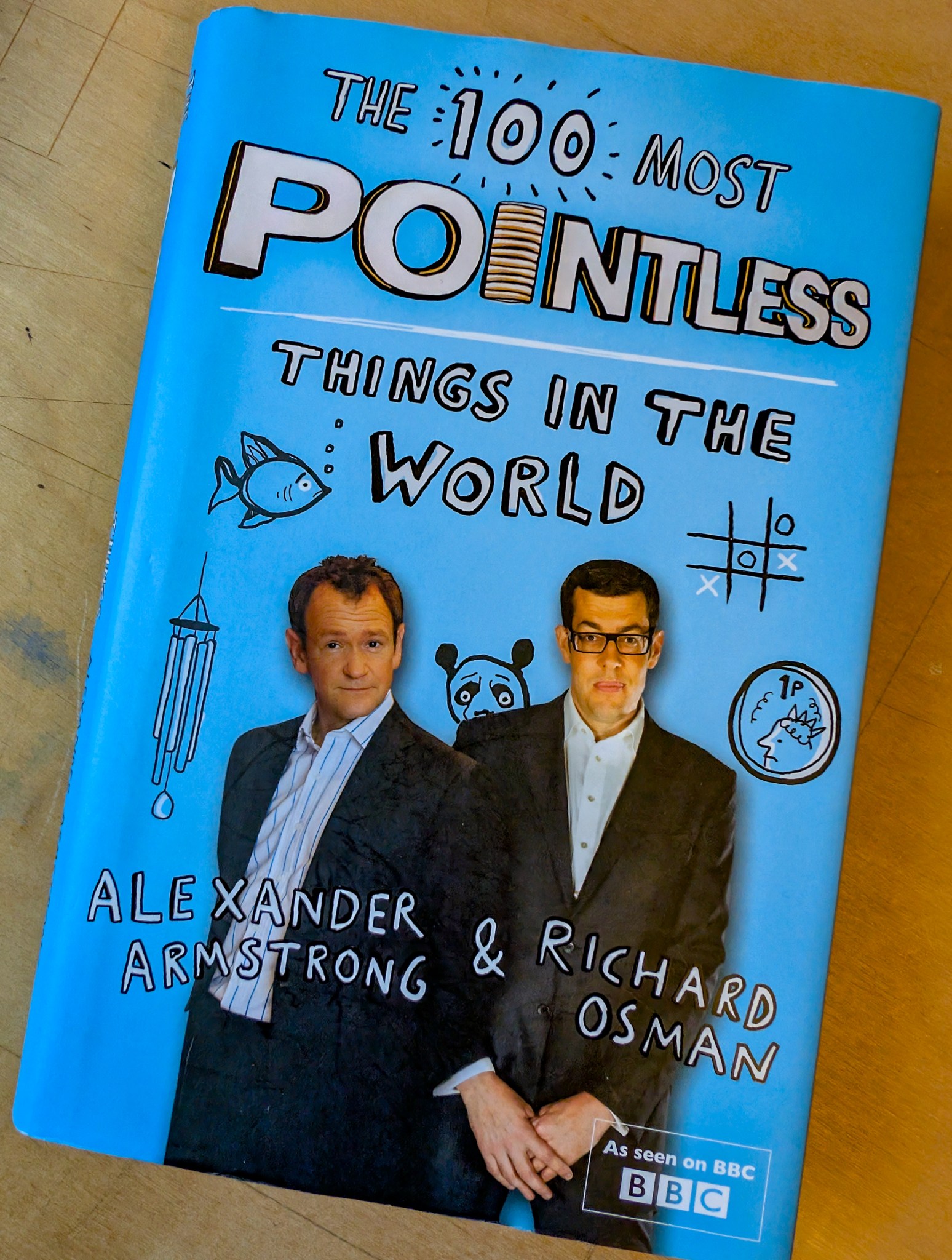 It’s a well-written book. Lots of humour. Some of the ‘pointless’ items you’ll clap your hands over, give a thumbs-up, cry ‘Yeah!’, others you’ll muse over before deciding, and one or two you’ll probably disagree with on sight.